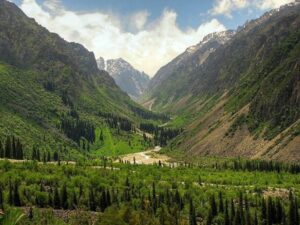 The valley is filled with beautiful spruce forests typical of the Tian Shan Mountains, providing cool shade and scenic hiking trails.
